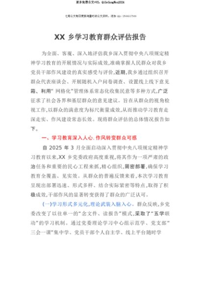 【七哥公文】2025年:【七哥公文】XX乡贯彻中央八项规定精神学习教育群众评估报告+更多免费公文+VX:QiGeGongWen2024+更多免费公文+VX:QiGeGongWen2024