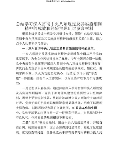 【七哥公文】2025年:【七哥公文】总结学习深入贯彻中央八项规定及其实施细则精神的成效和经验主题研讨发言材料_20250815_213030+更多免费公文+VX:QiGeGongWen2024+更多免费公文+VX:QiGeGongWen2024
