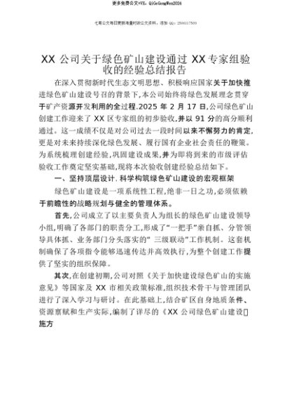 【七哥公文】2025年:【七哥公文】XX公司关于绿色矿山建设通过XX专家组验收的经验总结报告+更多免费公文+VX:QiGeGongWen2024+更多免费公文+VX:QiGeGongWen2024