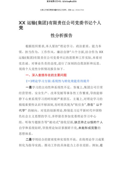 【七哥公文】2025年:【七哥公文】XX运输(集团)有限责任公司党委书记个人党性分析报告+更多免费公文+VX:QiGeGongWen2024+更多免费公文+VX:QiGeGongWen2024