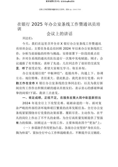 【七哥公文】2025年:【七哥公文】在银行2025年办公室条线工作暨通讯员培训会议上的讲话+更多免费公文+VX:QiGeGongWen2024+更多免费公文+VX:QiGeGongWen2024