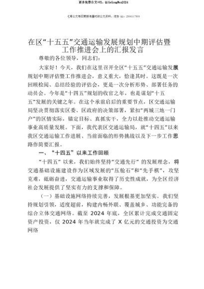 【七哥公文】2025年:【七哥公文】在区“十五五”交通运输发展规划中期评估暨工作推进会上的汇报发言+更多免费公文+VX:QiGeGongWen2024+更多免费公文+VX:QiGeGongWen2024