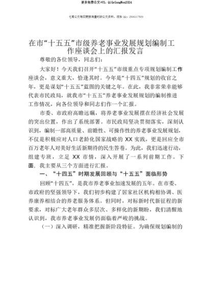 【七哥公文】2025年:【七哥公文】在市“十五五”市级养老事业发展规划编制工作座谈会上的汇报发言+更多免费公文+VX:QiGeGongWen2024+更多免费公文+VX:QiGeGongWen2024