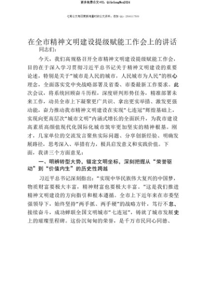 【七哥公文】2025年:【七哥公文】在全市精神文明建设提级赋能工作会上的讲话+更多免费公文+VX:QiGeGongWen2024+更多免费公文+VX:QiGeGongWen2024