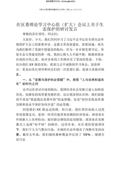 【七哥公文】2025年:【七哥公文】在区委理论学习中心组(扩大)会议上关于生态保护的研讨发言+更多免费公文+VX:QiGeGongWen2024+更多免费公文+VX:QiGeGongWen2024