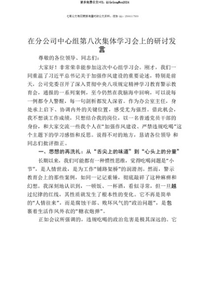 【七哥公文】2025年:【七哥公文】在分公司中心组第八次集体学习会上的研讨发言+更多免费公文+VX:QiGeGongWen2024+更多免费公文+VX:QiGeGongWen2024