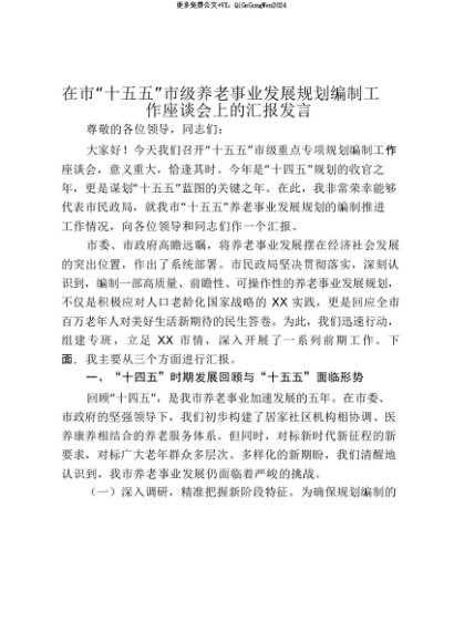 【七哥公文】2025年:【七哥公文】在市“十五五”市级养老事业发展规划编制工作座谈会上的汇报发言_20250815_213029+更多免费公文+VX:QiGeGongWen2024+更多免费公文+VX:QiGeGongWen2024