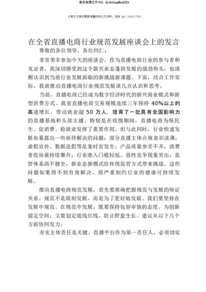 【七哥公文】2025年:【七哥公文】在全省直播电商行业规范发展座谈会上的发言+更多免费公文+VX:QiGeGongWen2024+更多免费公文+VX:QiGeGongWen2024
