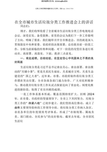 【七哥公文】2025年:【七哥公文】在全市城市生活垃圾分类工作推进会上的讲话+更多免费公文+VX:QiGeGongWen2024+更多免费公文+VX:QiGeGongWen2024