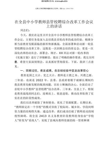 【七哥公文】2025年:【七哥公文】在全县中小学教师县管校聘综合改革工作会议上的讲话+更多免费公文+VX:QiGeGongWen2024+更多免费公文+VX:QiGeGongWen2024