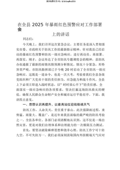 【七哥公文】2025年:【七哥公文】在全县2025年暴雨红色预警应对工作部署会上的讲话_20250815_213029+更多免费公文+VX:QiGeGongWen2024+更多免费公文+VX:QiGeGongWen2024