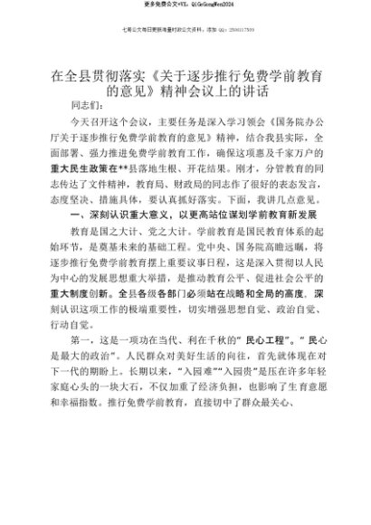 【七哥公文】2025年:【七哥公文】在全县贯彻落实《关于逐步推行免费学前教育的意见》精神会议上的讲话+更多免费公文+VX:QiGeGongWen2024+更多免费公文+VX:QiGeGongWen2024