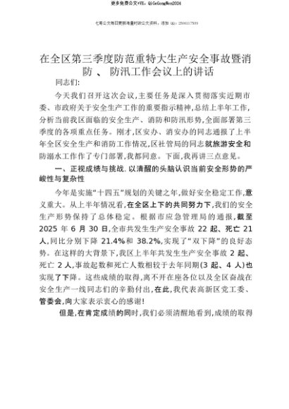 【七哥公文】2025年:【七哥公文】在全区第三季度防范重特大生产安全事故暨消防、防汛工作会议上的讲话+更多免费公文+VX:QiGeGongWen2024+更多免费公文+VX:QiGeGongWen2024