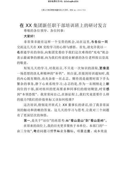 【七哥公文】2025年:【七哥公文】在XX集团新任职干部培训班上的研讨发言+更多免费公文+VX:QiGeGongWen2024+更多免费公文+VX:QiGeGongWen2024