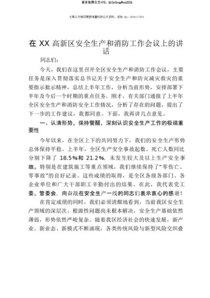 【七哥公文】2025年:【七哥公文】在XX高新区安全生产和消防工作会议上的讲话+更多免费公文+VX:QiGeGongWen2024+更多免费公文+VX:QiGeGongWen2024