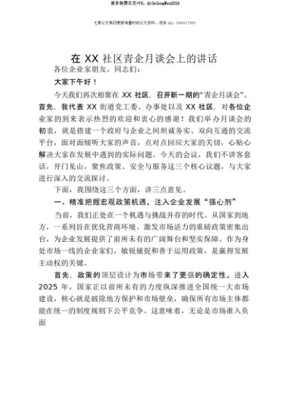 【七哥公文】2025年:【七哥公文】在XX社区青企月谈会上的讲话+更多免费公文+VX:QiGeGongWen2024+更多免费公文+VX:QiGeGongWen2024