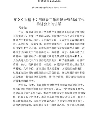 【七哥公文】2025年:【七哥公文】在XX市精神文明建设工作座谈会暨创城工作推进会上的讲话+更多免费公文+VX:QiGeGongWen2024+更多免费公文+VX:QiGeGongWen2024