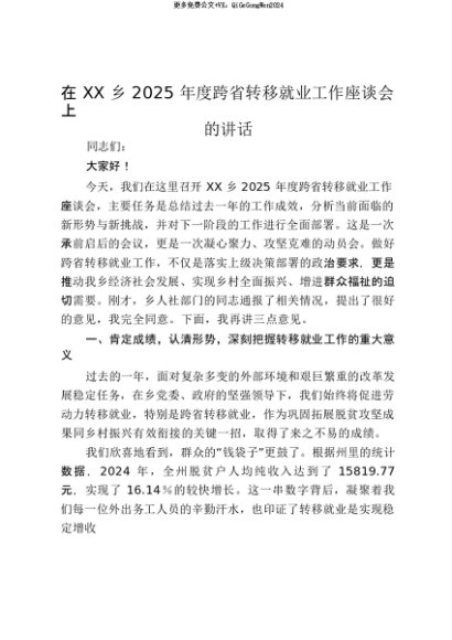 【七哥公文】2025年:【七哥公文】在XX乡2025年度跨省转移就业工作座谈会上的讲话_20250815_213027+更多免费公文+VX:QiGeGongWen2024+更多免费公文+VX:QiGeGongWen2024