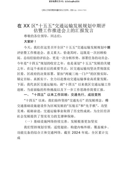 【七哥公文】2025年:【七哥公文】在XX区“十五五”交通运输发展规划中期评估暨工作推进会上的汇报发言+更多免费公文+VX:QiGeGongWen2024+更多免费公文+VX:QiGeGongWen2024