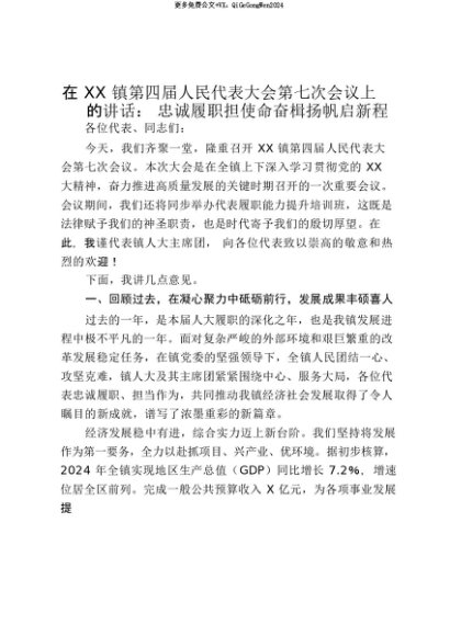 【七哥公文】2025年:【七哥公文】在XX镇第四届人民代表大会第七次会议上的讲话:忠诚履职担使命奋楫扬帆启新程_20250815_213028+更多免费公文+VX:QiGeGongWen2024+更多免费公文+VX:QiGeGongWen2024