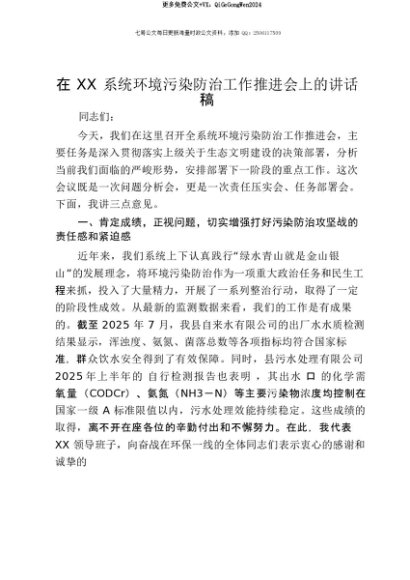 【七哥公文】2025年:【七哥公文】在XX系统环境污染防治工作推进会上的讲话稿+更多免费公文+VX:QiGeGongWen2024+更多免费公文+VX:QiGeGongWen2024