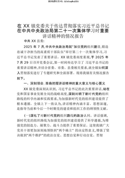【七哥公文】2025年:【七哥公文】在XX镇党委关于传达贯彻落实习近平总书记在中共中央政治局第二十一次集体学习时重要讲话精神的情况报告_20250815_213028+更多免费公文+VX:QiGeGongWen2024+更多免费公文+VX:QiGeGongWen2024