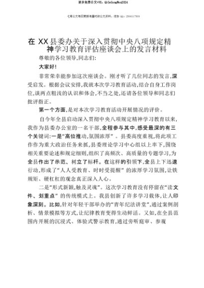 【七哥公文】2025年:【七哥公文】在XX县委办关于深入贯彻中央八项规定精神学习教育评估座谈会上的发言材料+更多免费公文+VX:QiGeGongWen2024+更多免费公文+VX:QiGeGongWen2024