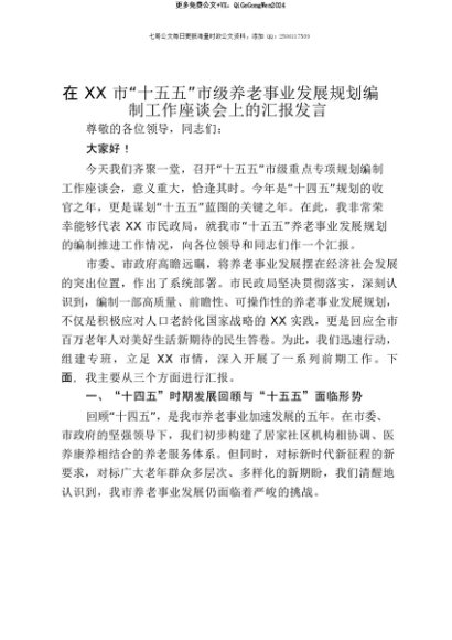 【七哥公文】2025年:【七哥公文】在XX市“十五五”市级养老事业发展规划编制工作座谈会上的汇报发言+更多免费公文+VX:QiGeGongWen2024+更多免费公文+VX:QiGeGongWen2024