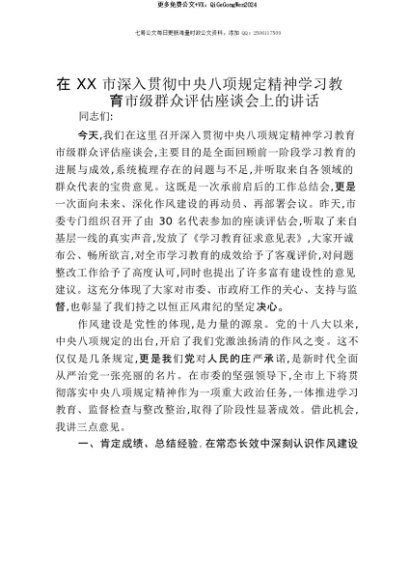 【七哥公文】2025年:【七哥公文】在XX市深入贯彻中央八项规定精神学习教育市级群众评估座谈会上的讲话+更多免费公文+VX:QiGeGongWen2024+更多免费公文+VX:QiGeGongWen2024