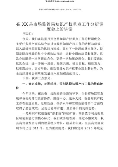 【七哥公文】2025年:【七哥公文】在XX县市场监管局知识产权重点工作分析调度会上的讲话+更多免费公文+VX:QiGeGongWen2024+更多免费公文+VX:QiGeGongWen2024