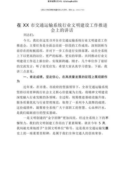 【七哥公文】2025年:【七哥公文】在XX市交通运输系统行业文明建设工作推进会上的讲话+更多免费公文+VX:QiGeGongWen2024+更多免费公文+VX:QiGeGongWen2024