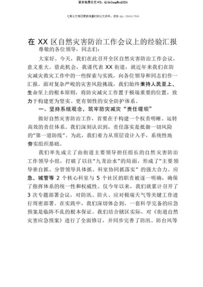 【七哥公文】2025年:【七哥公文】在XX区自然灾害防治工作会议上的经验汇报+更多免费公文+VX:QiGeGongWen2024+更多免费公文+VX:QiGeGongWen2024