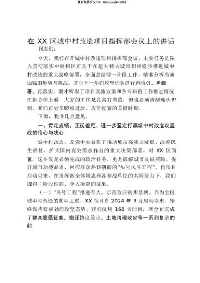 【七哥公文】2025年:【七哥公文】在XX区城中村改造项目指挥部会议上的讲话2_20250815_213027+更多免费公文+VX:QiGeGongWen2024+更多免费公文+VX:QiGeGongWen2024