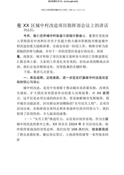 【七哥公文】2025年:【七哥公文】在XX区城中村改造项目指挥部会议上的讲话2+更多免费公文+VX:QiGeGongWen2024+更多免费公文+VX:QiGeGongWen2024