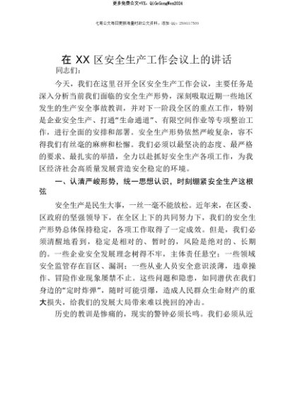 【七哥公文】2025年:【七哥公文】在XX区安全生产工作会议上的讲话+更多免费公文+VX:QiGeGongWen2024+更多免费公文+VX:QiGeGongWen2024