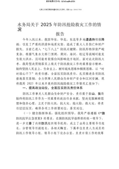 【七哥公文】2025年:【七哥公文】水务局关于2025年防汛抢险救灾工作的情况报告+更多免费公文+VX:QiGeGongWen2024+更多免费公文+VX:QiGeGongWen2024