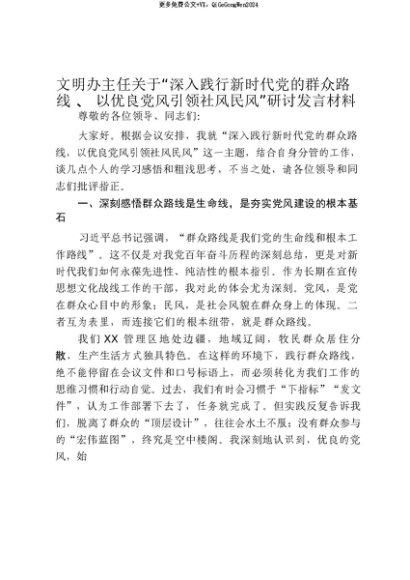 【七哥公文】2025年:【七哥公文】文明办主任关于“深入践行新时代党的群众路线、以优良党风引领社风民风”研讨发言材料_20250815_213027+更多免费公文+VX:QiGeGongWen2024+更多免费公文+VX:QiGeGongWen2024