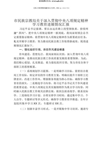 【七哥公文】2025年:【七哥公文】市民族宗教局关于深入贯彻中央八项规定精神学习教育进展情况汇报+更多免费公文+VX:QiGeGongWen2024+更多免费公文+VX:QiGeGongWen2024