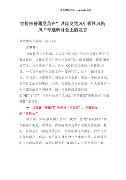 【七哥公文】2025年:【七哥公文】宣传部普通党员在“以优良党风引领社风民风”专题研讨会上的发言+更多免费公文+VX:QiGeGongWen2024+更多免费公文+VX:QiGeGongWen2024