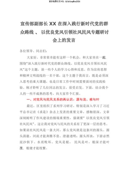 【七哥公文】2025年:【七哥公文】宣传部副部长XX在深入践行新时代党的群众路线、以优良党风引领社风民风专题研讨会上的发言_20250815_213027+更多免费公文+VX:QiGeGongWen2024+更多免费公文+VX:QiGeGongWen2024