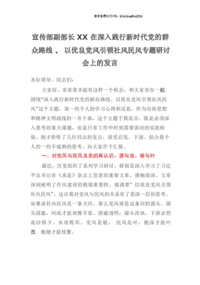 【七哥公文】2025年:【七哥公文】宣传部副部长XX在深入践行新时代党的群众路线、以优良党风引领社风民风专题研讨会上的发言+更多免费公文+VX:QiGeGongWen2024+更多免费公文+VX:QiGeGongWen2024