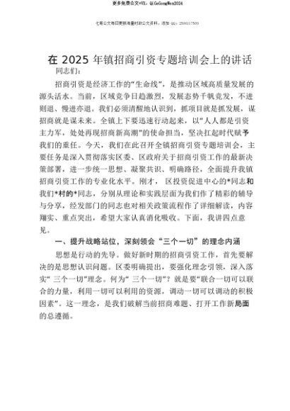 【七哥公文】2025年:【七哥公文】在2025年镇招商引资专题培训会上的讲话+更多免费公文+VX:QiGeGongWen2024+更多免费公文+VX:QiGeGongWen2024