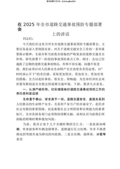 【七哥公文】2025年:【七哥公文】在2025年全市道路交通事故预防专题部署会上的讲话_20250815_213026+更多免费公文+VX:QiGeGongWen2024+更多免费公文+VX:QiGeGongWen2024