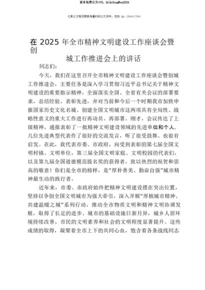 【七哥公文】2025年:【七哥公文】在2025年全市精神文明建设工作座谈会暨创城工作推进会上的讲话+更多免费公文+VX:QiGeGongWen2024+更多免费公文+VX:QiGeGongWen2024