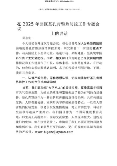 【七哥公文】2025年:【七哥公文】在2025年园区基孔肯雅热防控工作专题会议上的讲话+更多免费公文+VX:QiGeGongWen2024+更多免费公文+VX:QiGeGongWen2024