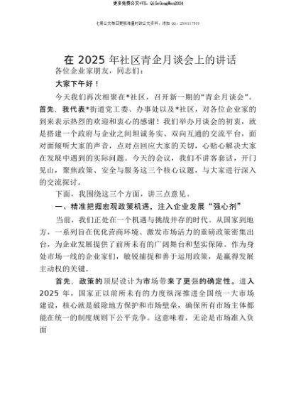 【七哥公文】2025年:【七哥公文】在2025年社区青企月谈会上的讲话+更多免费公文+VX:QiGeGongWen2024+更多免费公文+VX:QiGeGongWen2024