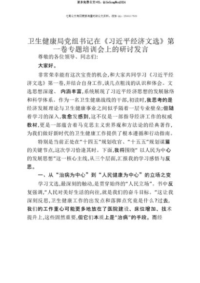 【七哥公文】2025年:【七哥公文】卫生健康局党组书记在《习近平经济文选》第一卷专题培训会上的研讨发言+更多免费公文+VX:QiGeGongWen2024+更多免费公文+VX:QiGeGongWen2024
