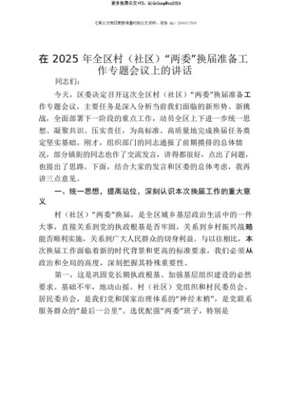 【七哥公文】2025年:【七哥公文】在2025年全区村(社区)“两委”换届准备工作专题会议上的讲话+更多免费公文+VX:QiGeGongWen2024+更多免费公文+VX:QiGeGongWen2024