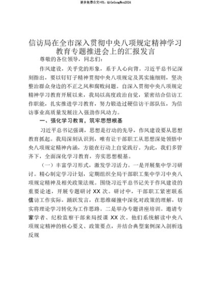 【七哥公文】2025年:【七哥公文】信访局在全市深入贯彻中央八项规定精神学习教育专题推进会上的汇报发言_20250815_213025+更多免费公文+VX:QiGeGongWen2024+更多免费公文+VX:QiGeGongWen2024
