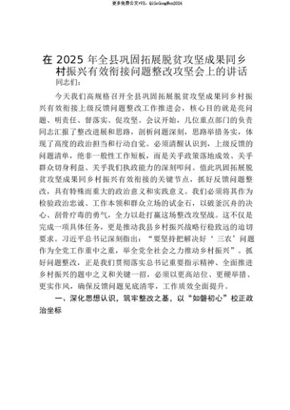 【七哥公文】2025年:【七哥公文】在2025年全县巩固拓展脱贫攻坚成果同乡村振兴有效衔接问题整改攻坚会上的讲话_20250815_213026+更多免费公文+VX:QiGeGongWen2024+更多免费公文+VX:QiGeGongWen2024